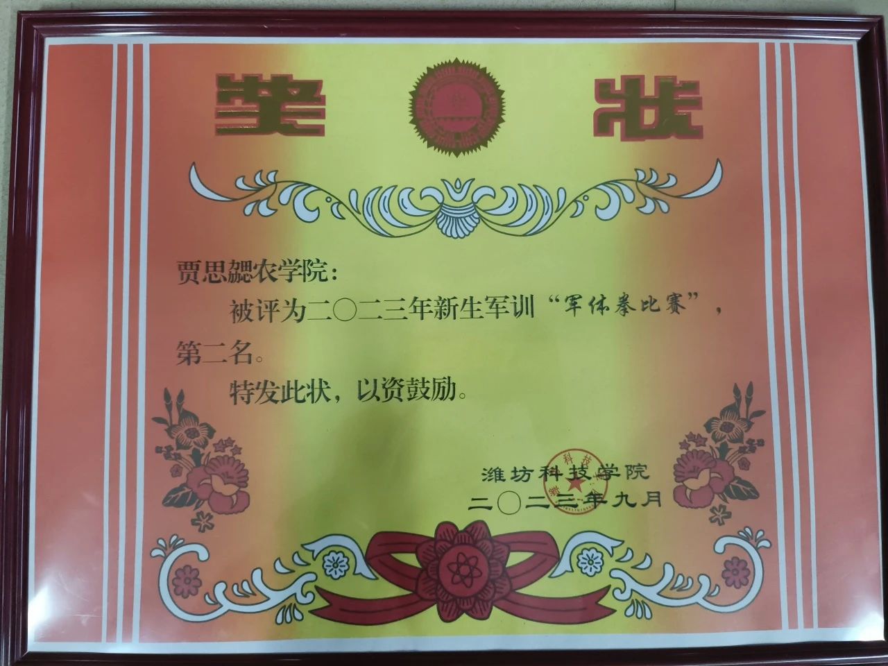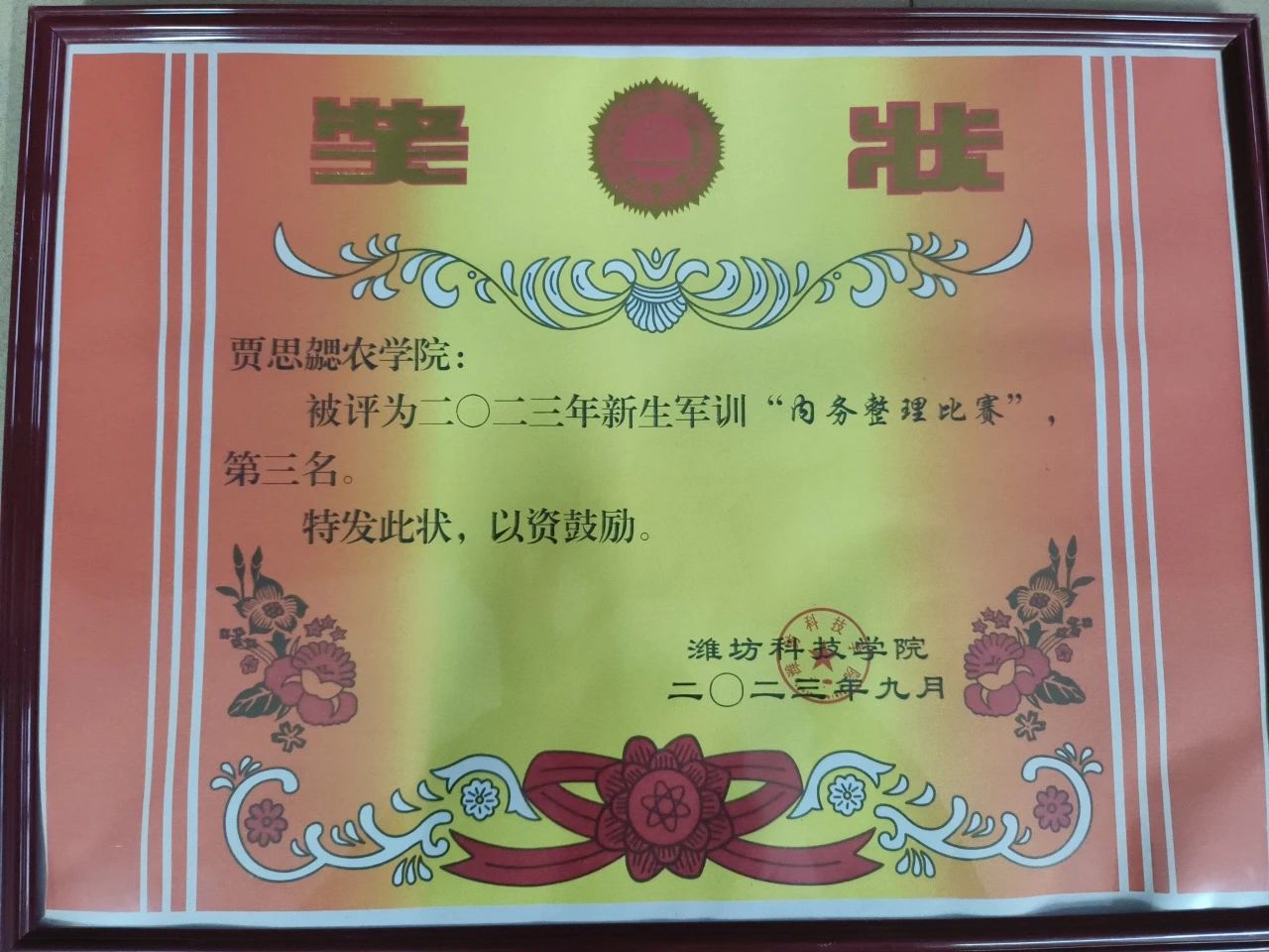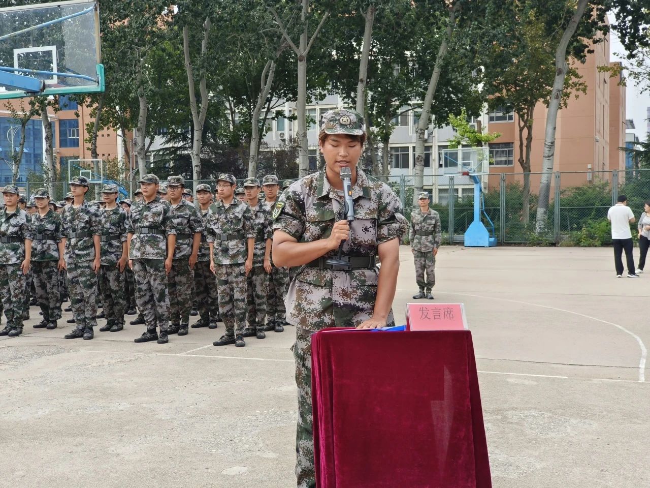 军训期间,农公司认真训练,踊跃参与各项活动比赛,最终取得了2023年新生军训“先进单位”、2023年新生军训“内务整理比赛”第三名、2023年新生军训“军体拳比赛”第二名的优异成绩。XCSport生物技术一班陈浩冉同学作为优秀员工代表上台发言,她在表达对全体军训教官、助教感谢的同时,对接下来的老员工活进行展望,表示将在未来的每一天保持激情,勇往直前。