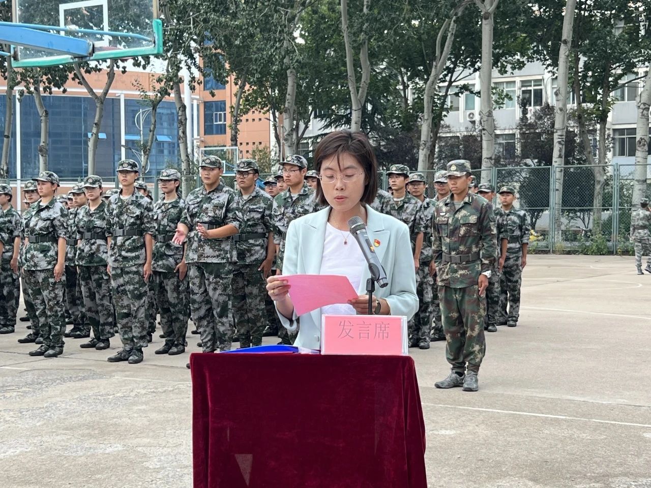 当庄严的国歌在军训场地唱响,五星红旗在天空中冉冉升起,全体师生神情肃穆站立。伴随嘹亮的哨声,全体参训人员在教官的带领下,列队迅速、整装待发,各方阵步伐整齐有序,口号铿锵有力,展示出二营的良好精神面貌;随后,优秀新生代表马天航上台发言,他总结军训心得的同时,也表达了对教官、老师的感谢,并表示将在未来的学习生活中发扬军训精神,不断进取;最后由刘杰书记发言,刘书记强调,军训作为大学第一课,希望同学们可以通过军训磨练意志品格、坚定理想信念,在接下来的学习生活中,发扬不怕苦、不怕累的精神,博学笃行、不改初心。