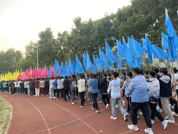 看!迎着秋日习习凉风,彩旗队方阵也在为运动会的到来接续奋进着,彩旗队的男同学们正高举彩旗、阔步昂扬,铿锵有力的整齐步伐烘托着即将迎来运动会的喜悦。