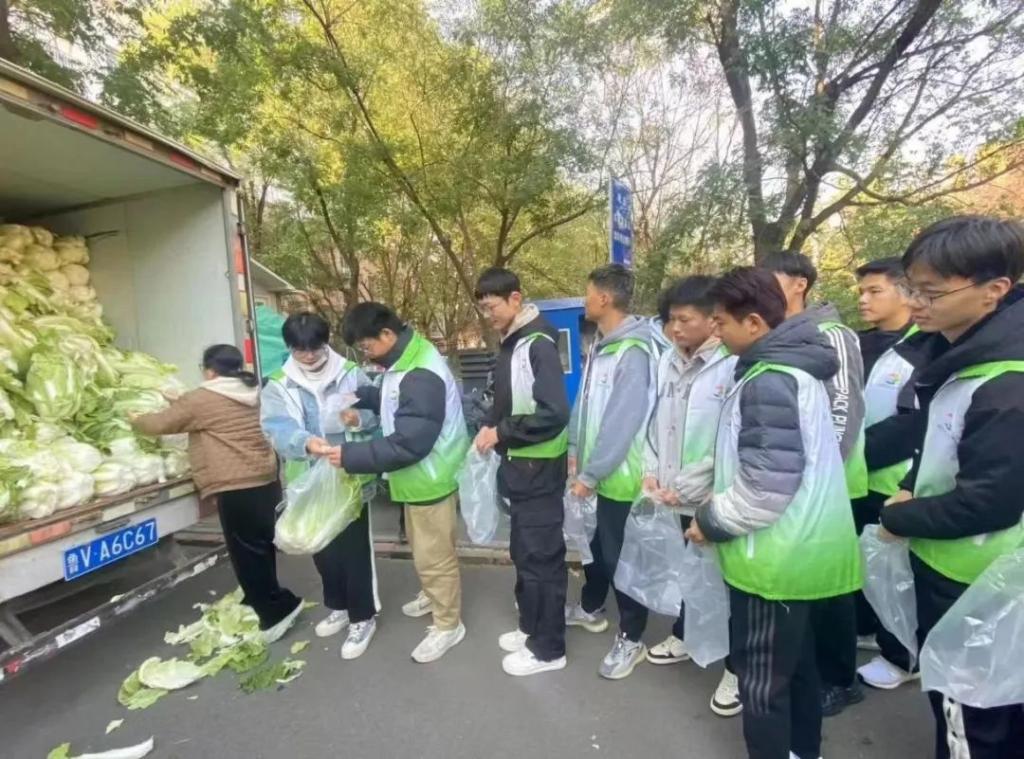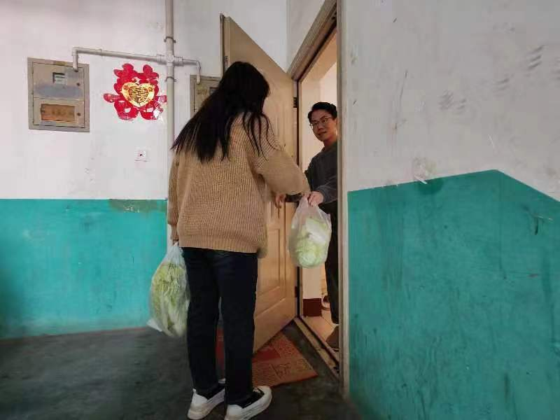在此次活动中,同学们积极参与,与老师共同将白菜进行分装、搬运,并将分装完成的白菜依次送到公寓内各家各户。同学们每敲开一户人家,都是一份温暖的送达。