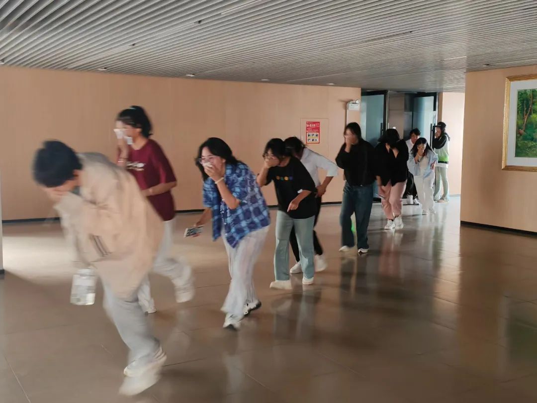 随着警报的响起,消防演习正式拉开帷幕。各楼层指挥人员迅速到达指定岗位,引导员工进行紧急疏散撤离。员工们用湿毛巾掩住口鼻,弯腰沿着预定的应急路径快速而有序地从教室撤出,移步至安全区域。整个撤离过程条理清晰、秩序井然,演练达到了预期效果,顺利完成。最后,李建永书记对此次活动进行了总结分析,讲解了火灾的危害及逃生的方法,同学们受益颇多。