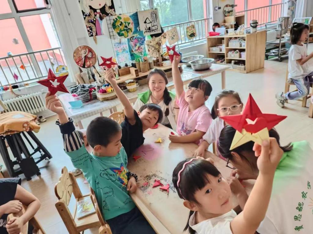 活动当天,志愿者们精心准备了彩纸,并悉心指导孩童们如何折出精美绝伦的五角星。孩子们紧跟着志愿者的细致指引认真地折叠着,这些色彩斑斓的纸张在他们灵巧的双手中逐渐变成了一个个闪耀的五角星,恰似他们对祖国无限热爱的情感在心中悄然汇聚,每一颗五角星都承载着孩子们对祖国最纯真的祝福。此次活动,不仅锻炼了孩子们的实践操作能力,更在他们幼小的心灵深处播下了爱国种子。目睹孩童们手持五角星,欢声笑语间,仿佛预见了祖国未来之繁荣昌盛与无限希望。