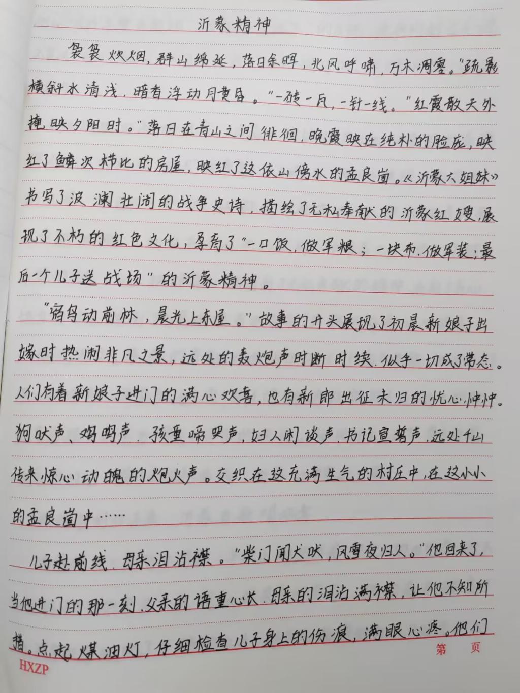 沂蒙精神是伟大的红色革命精神,是中华民族优秀文化的重要组成部分,同学们通过征文的形式以“弘扬沂蒙精神,践行初心使命”“沂蒙精神,薪火相传”等为主题,充分认识到作为新时代青年,深知幸福的生活来之不易,应无比珍惜,要时刻铭记先辈们艰苦奋斗、爱党爱军的历史,学好本领,建设家乡,弘扬爱国主义精神。以此引导身边的同学立足本职岗位,争创时代伟业,奋斗青春、不负韶华,追逐梦想、不负时代,走好新时代的长征路!