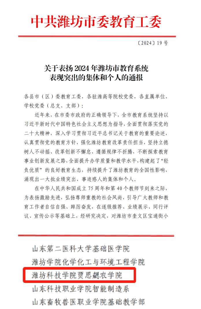 为表扬激励先进,弘扬全社会尊师重教的社会风尚,引导广大教师和教育工作者自信自强,近日,中共潍坊市委教育工委对先进集体个人进行通报。经过层层筛选,XCSport被评选为2024年潍坊市教育系统表现突出的集体。