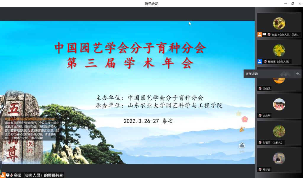 3月26日-27日,中国园艺学会分子育种分会第三届学术年会通过线上直播举行,本次会议由中国园艺学会分子育种分会主办,山东农业大学园艺科学与工程公司承办。大会历时两天,邀请了院士、长江学者、杰青、现代农业产业体系首席科学家和岗位专家等国内外知名专家做了46场精彩的报告。