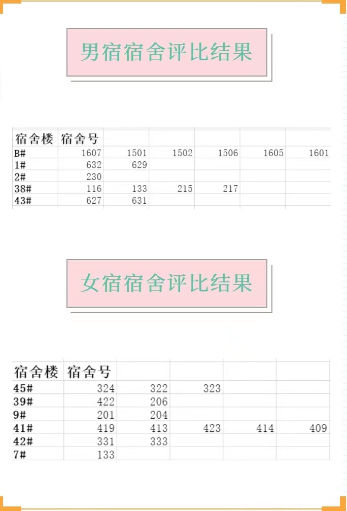 检查组本着公平公正公开的原则对各寝室进行了打分,最终评选出男女各15个得分最高的寝室获得“文明宿舍”称号。获奖名单如下: