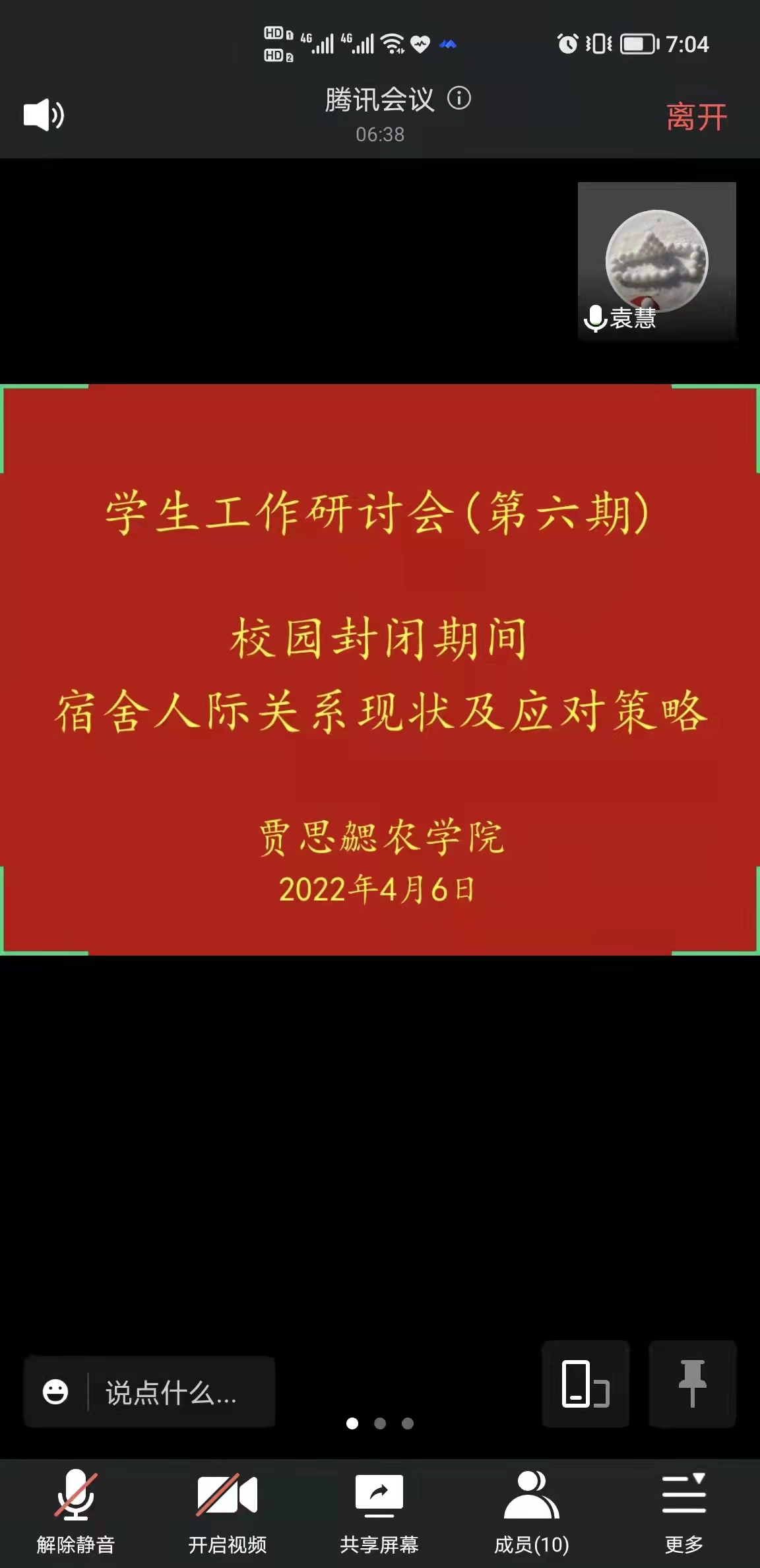 为进一步加强辅导员队伍建设,提高辅导员个人业务能力和职业素养,4月6日晚,XCSport在308会议室开展校园封闭期间宿舍人际关系现状及应对策略专题线上研讨,会议特邀山东商业职业技术公司团委副书记,第三届山东高校辅导员职业能力大赛一等奖获得者袁慧书记交流经验。农公司党支部书记刘杰主持会议,农公司全体辅导员参加本次研讨会。