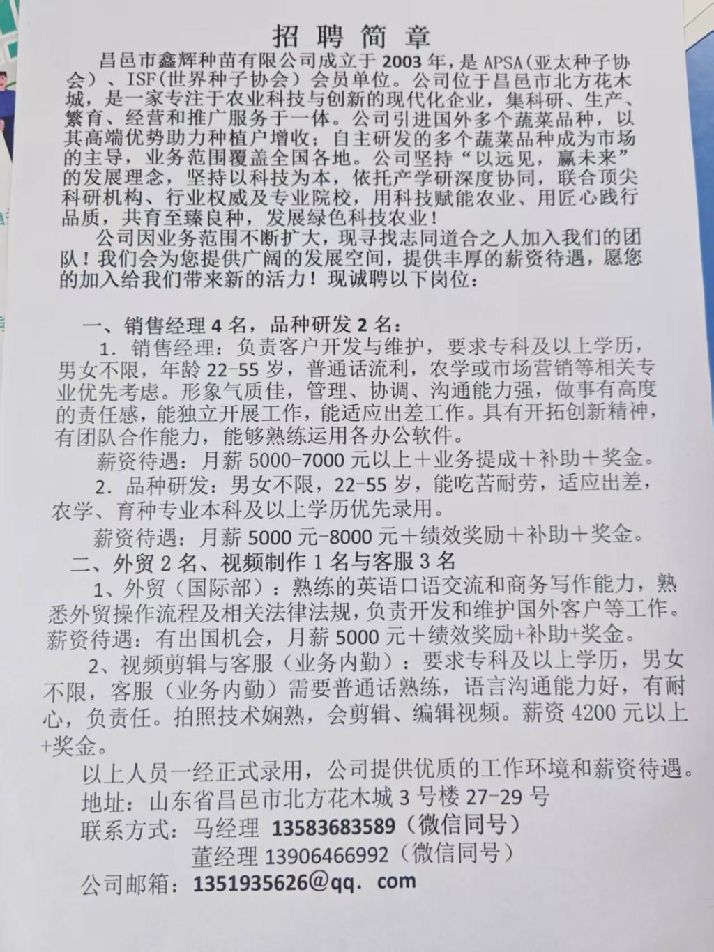 本公司是一家专注于农业科技与创新的现代化企业,集科研、生产、繁育、经营和推广服务于一体招聘销售经理4人,薪资5000—7000;品种研发2人,薪资5000—8000。要求专科及以上学历,农学专业优先。