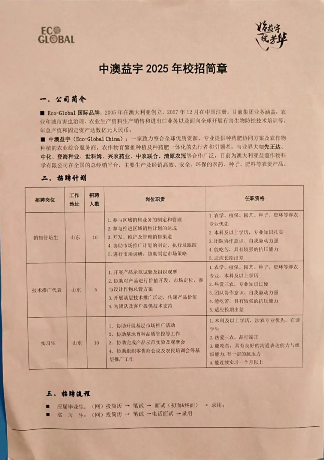 中澳益宇是一家致力整合全球优质资源、专业提供种药肥协同方案及农作物种植的农业综合服务商,农作物育繁推种植及种药肥一体化的先行者和引领者。招聘销售管培生、技术推广代表、实习生各10人,农学、植保、园艺、种子、资环等涉农专业优先,薪资6500。