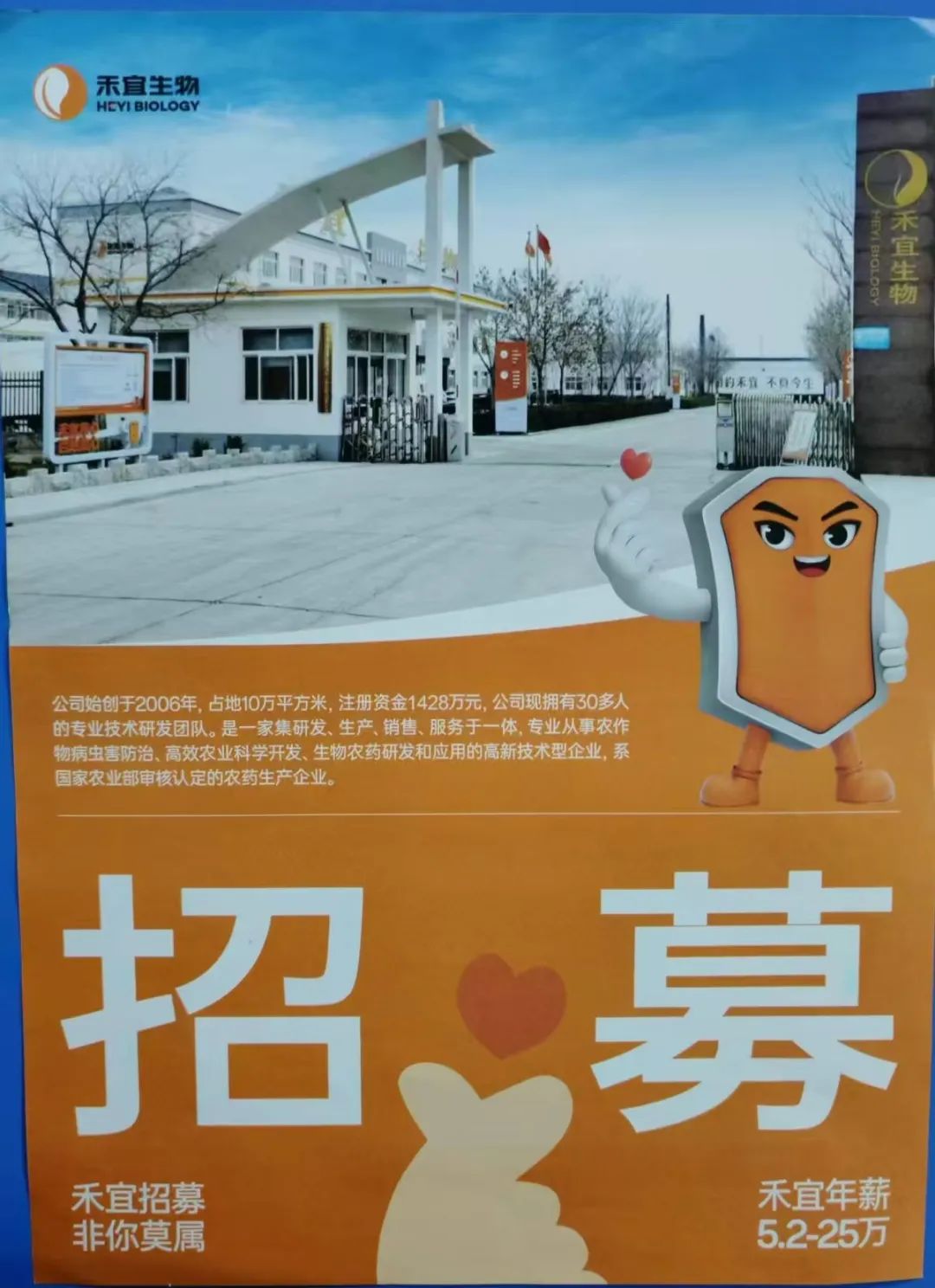 禾宜生物是一家集研发、生产、销售、服务于一体,专业从事农作物病虫害防治、高效农业科学开发、生物农药研发和应用的高新技术型企业。招聘销售精英(年薪10万+)、产品专员(薪资5000-10000),要求植保、农学等相关专业。