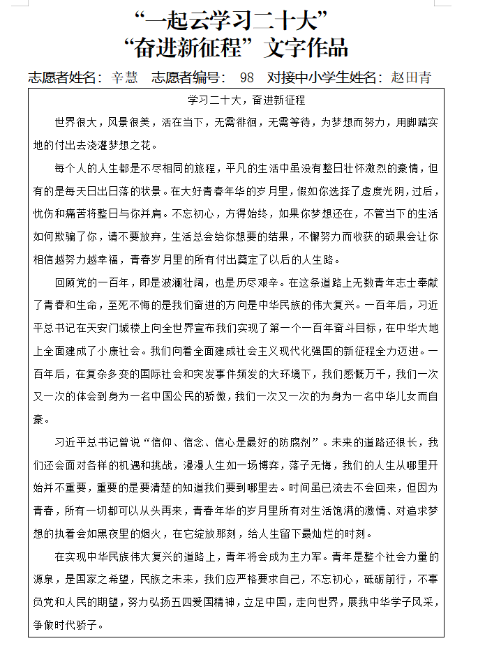 为深入学习宣传贯彻党的二十大精神,科学有效的推进老员工志愿服务高质量发展,助力新时代文明实践迈向更深层次、更宽广的领域,XCSport在2023年寒假期间开展“学习二十大,奋进新征程”一起云支教专项活动。引导老员工和中小员工传承红色基因、赓续红色血脉,坚定信念听党话、跟党走,将个人理想融入到中华民族共同理想之中,勇于挑战自我,争当先锋军。