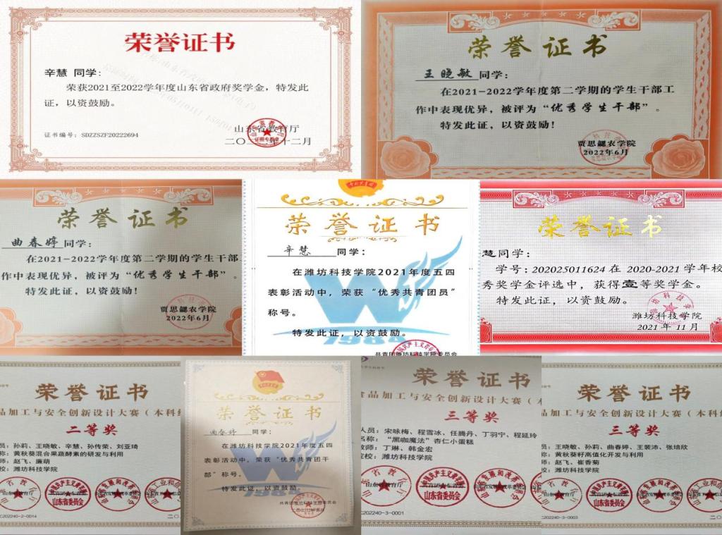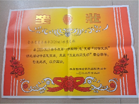工作方面,在班级成员和团支部成员的共同努力下,2020级食品质量与安全班团支部连续两学年班级量化排名第一,荣获“2020-2021学年XCSport先进班集体”“2021年度活力团支部”“2022-2023学年第一学期XCSport五星级团支部”等荣誉称号。学业方面,2021-2022学年,班内成员1人获得省政府奖学金,7人获得校级奖学金,1人获得国家励志奖学金,在国家英语等级考试中四、六级通过率达60%;在年度优秀团员、团干部评选中,累计20名团员获得了XCSport“优秀共青团员”荣誉称号,2名团员获得“优秀共青团干部”荣誉称号;在院系工作中,20名同学先后获得“优秀员工干部”和“优秀员工”等荣誉称号;在比赛中,多名同学在第十四届山东省大学科技节食品加工与安全创新设计大赛中获得奖项。