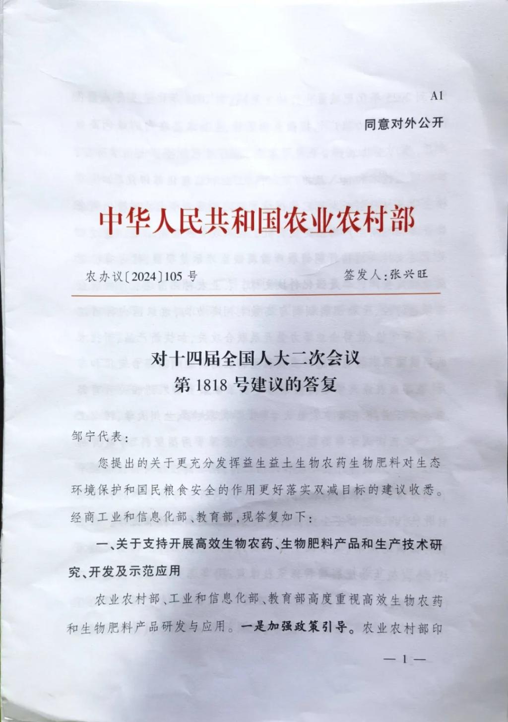 该建议聚焦国家战略部署,提出要充分发挥益生益土生物农药生物肥料对生态环境保护和国民粮食安全的作用,更好落实农药、化肥双减目标。大力推广包括微生物肥料、生物农药在内的绿色高效产品,推广生物农药替代化学农药,推行绿色防控替代化学防控,加快绿色技术和投入品推广应用。瞄准生物农药和生物肥料产业发展需要,聚合优势力量,支持农药和肥料科技创新,不断提升产业竞争力。聚集科研院所、高等学校、优势企业等力量开展联合攻关,加快新产品、新技术的研发应用。