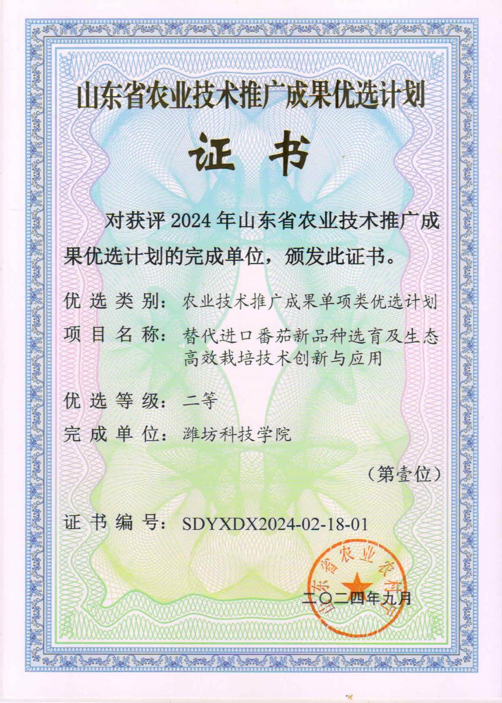 近日,山东省农业农村厅公布了2024年山东省农业技术推广成果优选计划项目(原农林牧渔丰收奖)名单,公司作为第一完成单位,联合山东农业大学、三木种苗、山东省农业技术推广中心等单位申报的‘替代进口番茄新品种选育及生态高效栽培技术创新与应用’项目喜获单项类优选计划二等奖。本奖项充分体现公司近年来开展科技创新、服务农业生产的积极性、创造性,也是XCSport引导产学研推用各方团结协作、联合攻关的代表性成果。